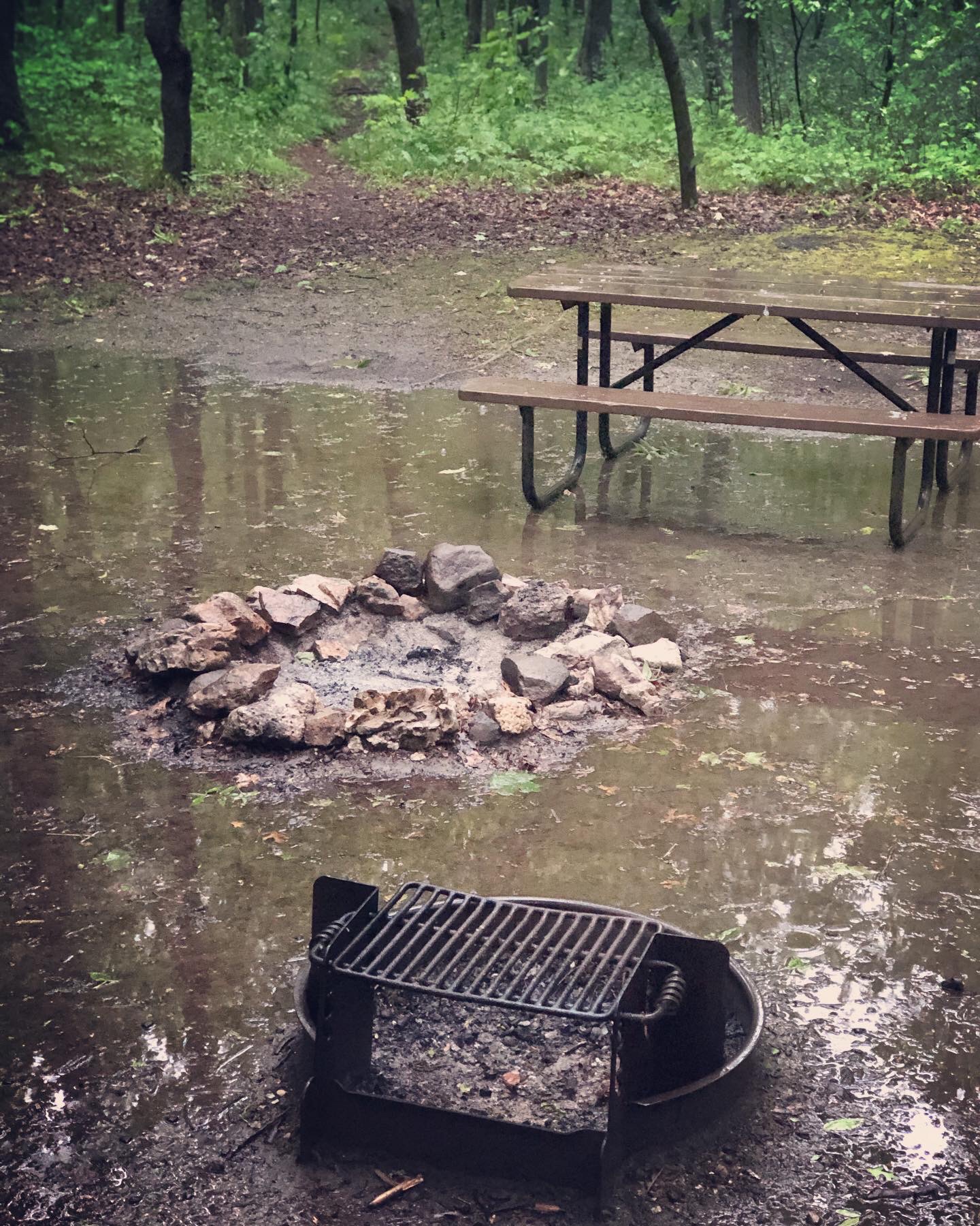 After I got everything back situated in the trailer, we headed for our campsite at Menomonee Park in Lannon, WI. Our site does not have hookups and is very tightly nestled into the trees. The weather hasn’t been as nice today and although it was in the mid 80’s, there was no sunshine in sight. After we set up camp, the rain started to pour and has nearly flooded our site.